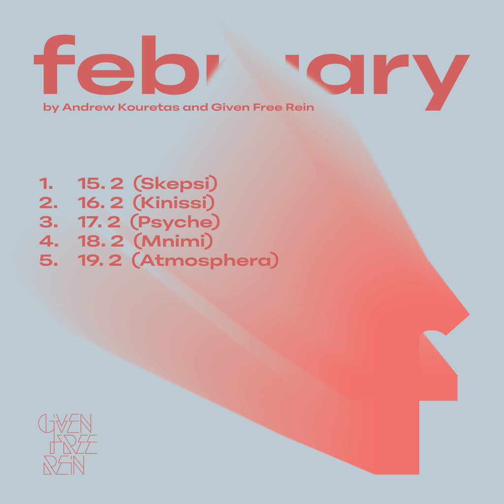 Andrew Kouretas, greek music producer and composer, while in the small town of Amfissa in 2023 experiencing the dark depressive ambience of the greek countryside, uses this ambience as music fuel and composes in five days from February 15th to 19th 2023, five electronic music tracks for his project Given Free Rein. Each of these five tracks has the name of the day of its composition. In the EP “February” Andrew Kouretas wants to depict without second thoughts and extra analysis the mood of each day. This resulted in the creation of 5 tracks of EDM instrumental music, each of these having a different vibe but all of them being a part of the dark music ambience of month February.